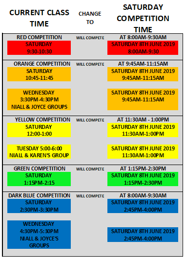 Please take note that your child’s competition time may be different to their current training time. All our competitions for all groups will be held on Saturday 8th and Sunday 9th of June 2019. If your child does a second class at the moment their competition will be at their original base class time. Classes continue until June 30th when we break for the summer months and will have summer camps. Registration for new term Starting September 2019 will be sent via email to all current member’s over the coming weeks.