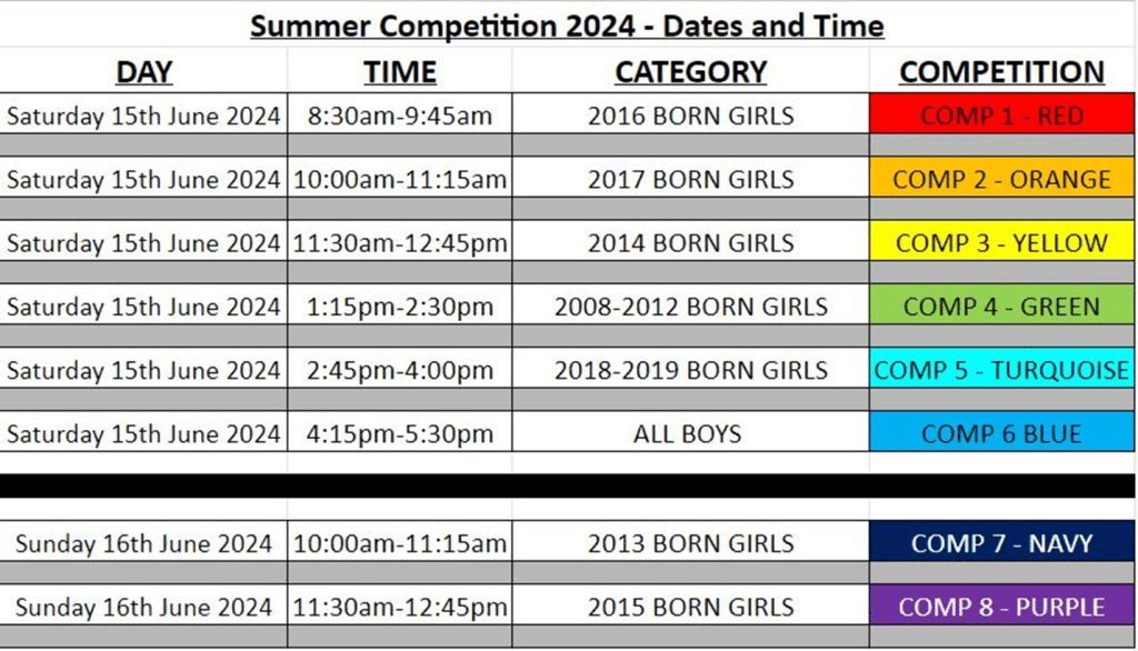 Posted on June 8, 2024, in Notices. Bookmark the permalink. Comments Off on 2024 Summer Competition Times.